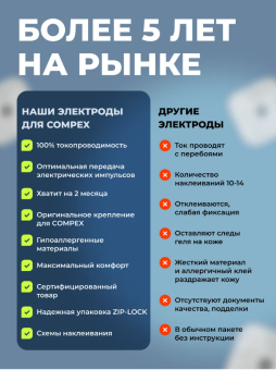 Комплект самоклеящихся электродов (2 шт.) для миостимуляторов Сompex любой модели (SP, Runner, Fit, Performance и др.) в герметичной запаянной упаковке.
