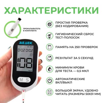 Глюкометр Медек откалиброван по крови и обладает следующими преимуществами:
