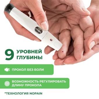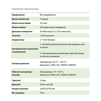 — В комплекте 50 шт. тест-полосок, 50 шт. ланцетов и ручка-прокалыватель с технологией проколы без боли.