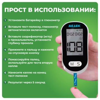 Глюкометр Медек с полным комплектом предназначен для удобного и быстрого контроля за уровнем глюкозы в крови в домашних условиях. Система контроля уровня глюкозы в крови предназначена как для профессиональных медиков, так и непосредственно для людей, самостоятельно контролирующих уровень глюкозы в крови.