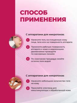 Токопроводящий гель для микротоков и косметологических процедур обеспечивает оптимальную проводимость электрических импульсов, подходит для микротоковой терапии, миостимуляции и EMS. RF-лифтинга. Токопроводящее средство для массажа выступает как проводник токов и эффективно при использовании в аппаратных процедурах. Обеспечивает плавное скольжение, снижает риск натирания и растяжения кожи при использовании ультразвукового оборудования, проведении массажа, кавитации, радиолифтинга, ультразвуковой чистки и других процедур. Применяется также как токопроводящий контактный гель для рф лифтинга и микротоков. Гель контактный для микротоков разработан для улучшения проходимости тока в глубокие слои кожи лица и тела, подходит для всех типов кожи, включая чувствительную, жирную и сухую.